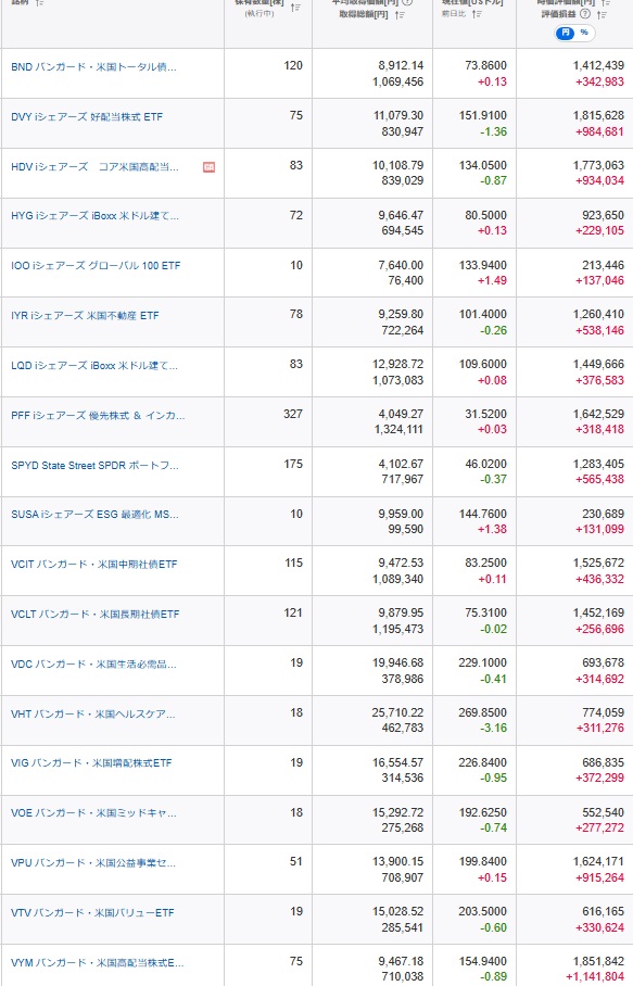 【ETF】保有米国ETFの状況 2026.4 2026.04.25 小心者です。 米国ETFは、小心者のアセットの中で全体の約10%を占めていて、リスク資産では一番多くなっています。 現在保有しているETFの損益状況です。(2026.4.25時点) 円ベースでは、今月も全てプラスですが、ドルベースでは引き続き債券系の6銘柄がマイナスのままです。PFFとVCLTが1600ドル超の大幅マイナスです ブログランキングに参加中