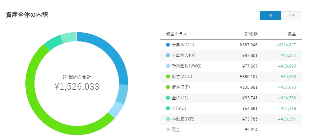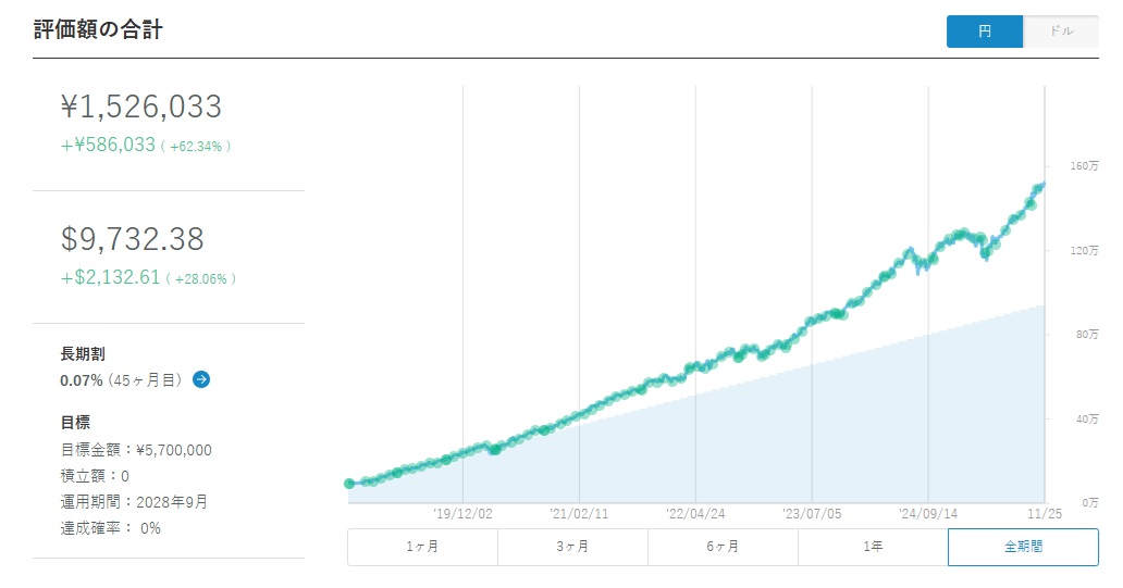 【ロボアド】ウェルスナビ開始86カ月の運用成績 OLYMPUS DIGITAL CAMERA 2025.11.25 小心者です。 ロボアドのウェルスナビを始めて86カ月の運用成績です。スタート時の100,000円と、月10,000円の積立で、現在950,000円での運用です。 リスク許容度2/5 今月は、評価額+586,033円、+62.34%でした。先月の+529,651円、+56.95%から少し増加。ドルベースで+28.06%と、こちらほぼ変わらずです。 スタートしてから6年半過ぎました。成績には満足しています。当面継続します。 ブログランキングに参加中