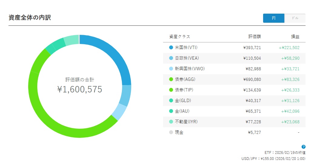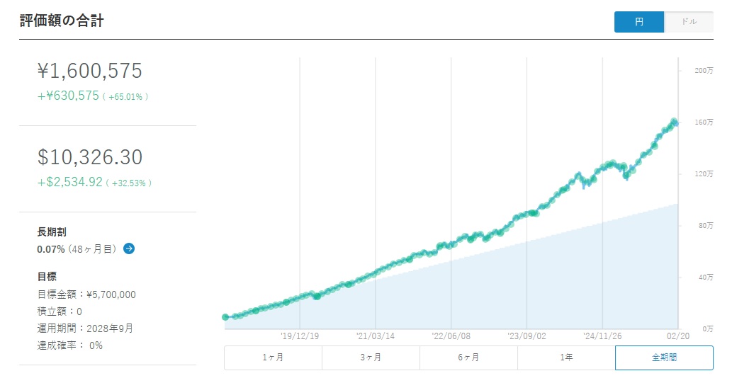 今月は、評価額+630,575円、+65.01%でした。先月の+640,359円、+66.70%からほぼ変わらずです。ドルベースで+32.53%と、こちらもほぼ変わらずです。