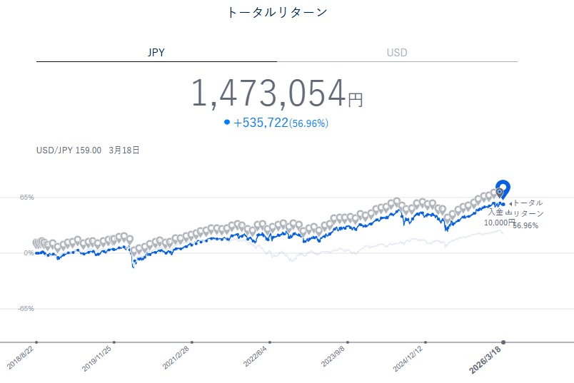 現在+56.96%。先月は+54.38%だったので、ほぼ変わらず。ドルベースでは+23.48%です。