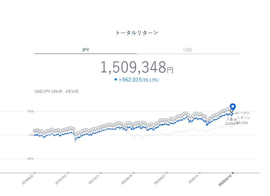 現在+59.13%。先月は+56.96%だったので、ほぼ変わらず。ドルベースでは+25.12%です。
