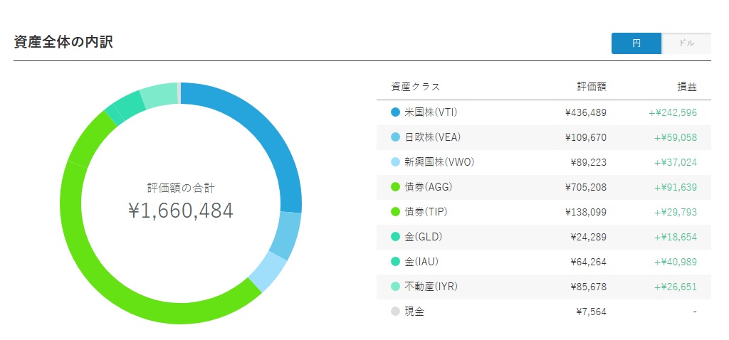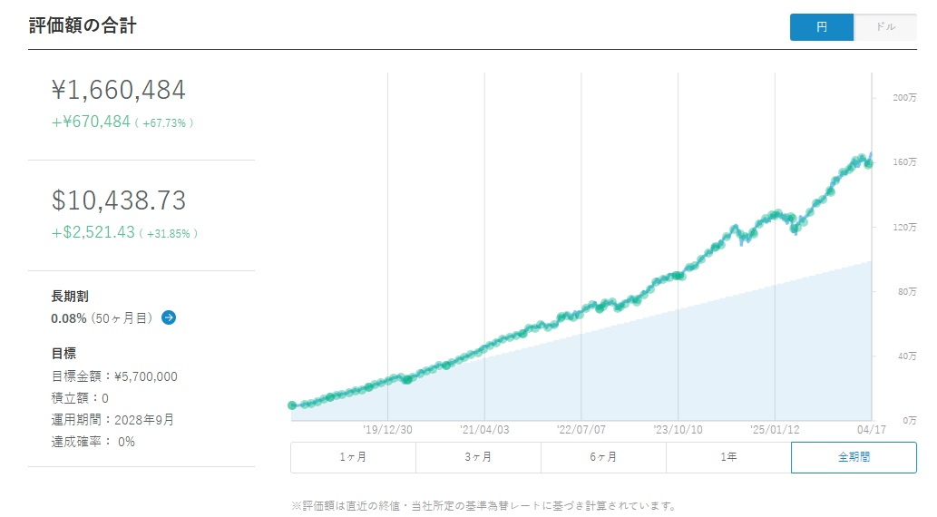 【ロボアド】ウェルスナビ開始91カ月の運用成績 2026.04.17 小心者です。 ロボアドのウェルスナビを始めて91カ月の運用成績です。スタート時の100,000円と、月10,000円の積立で、現在1,000,000円での運用です。 リスク許容度2/5 今月は、評価額+670,484円、+67.73%でした。先月の+601,680円、+61.40%から少し増です。ドルベースで+31.85%と、こちらも少し増でした。 スタートしてから7年半過ぎました。成績には満足しています。当面継続します。 ブログランキングに参加中